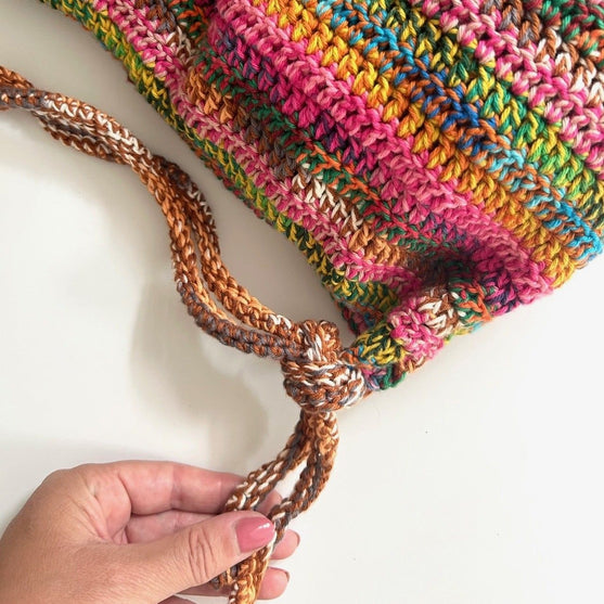 The double stranded stripes create a very colourful ensemble. I’d like to encourage you to experiment and combine different colours with multi-coloured ones. You’ll first make the body of the bag which consists of two identical panels. Then you’ll make two super long cords that will function as your straps and lastly you’ll sew everything together.