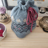 The bag is knitted in the round, starting at the top and finishing at the base and it's closed with an i-cord. The bag can be used as a craft bag or simply as a handbag if a handle is attached to it.