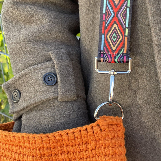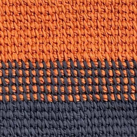 The bag is worked in the round with a tunisian crochet hook. The bag is worked in tunisian simple stitch, with a grey bottom, a striped middle section and the rest in orange. The border is finished with half double crochets. The bottom is also joined with half double crochets. The shoulder strap is added on to each side. See further explanation of tunisian crochet in the round in the back of the pattern.