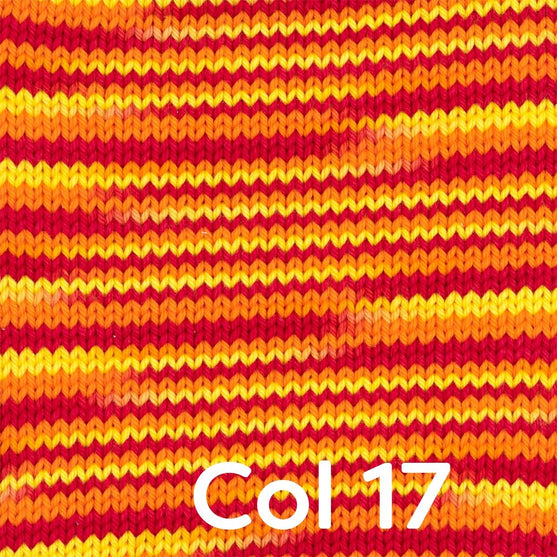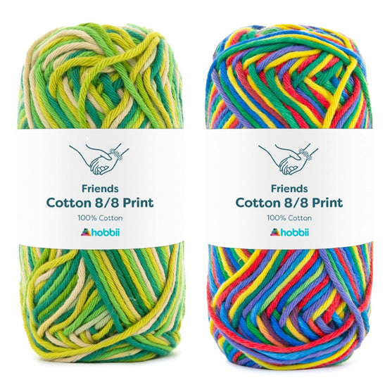 The printed hues vary from lively tone-on-tone colors to more fun and rainbow-like shades. In all cases, the color palette is vibrant and energetic. All the colors included in Friends Cotton 8/8 Print can be found in solid skeins in Friends Cotton 8/8. Find an exact overview of which Friends Cotton 8/8 Print color includes which solid colors below.