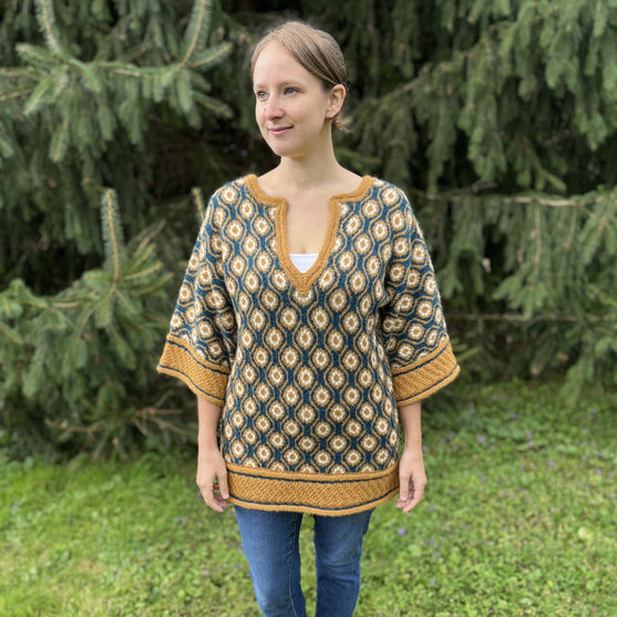 Inspired by 1960s “mod” wallpaper, the Terrapin Tunic offers a funky-fun way to glam up your knitting wardrobe this winter. Knit in the round from the bottom up, the body of this split-neck tunic uses stranded colorwork to create a bold, modern design. The ¾-length drop sleeves are cast on at the underarm (to keep the colorwork uninterrupted) and are then seamed using mattress stitch. The cuffs and hems are picked up holding MC double and worked flat with a textured stitch that complements the colorwork. The collar is picked up and worked in the round and uses increases and decreases in specific locations to accentuate the corners and shaping of the neckline. Perfect for home, the office, or a night out, this tunic is a great choice for edgy knitters who love to show off their work!