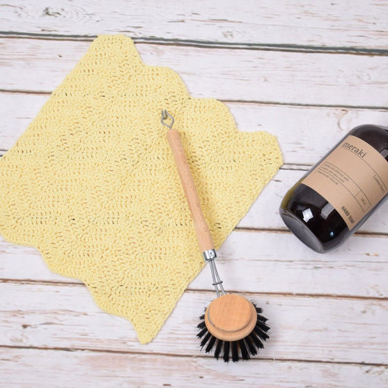 The dishcloth is crocheted in Rainbow Cotton 8/4, which is available in a wealth of beautiful colors.