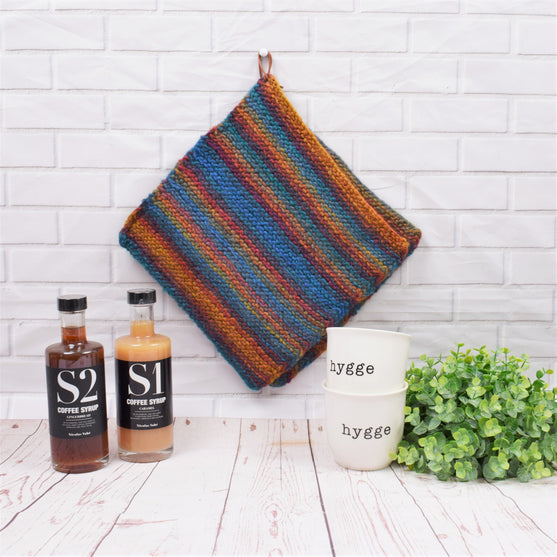 Spice up the kitchen with a set of multi colored pot holders. They are knitted in Woolpower Print that take care of the stripes itself.
