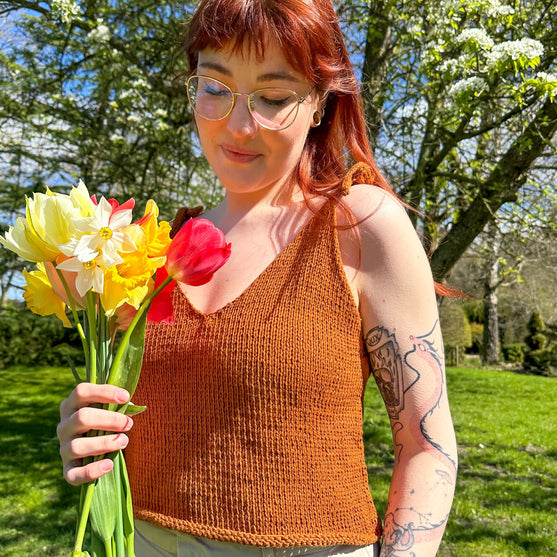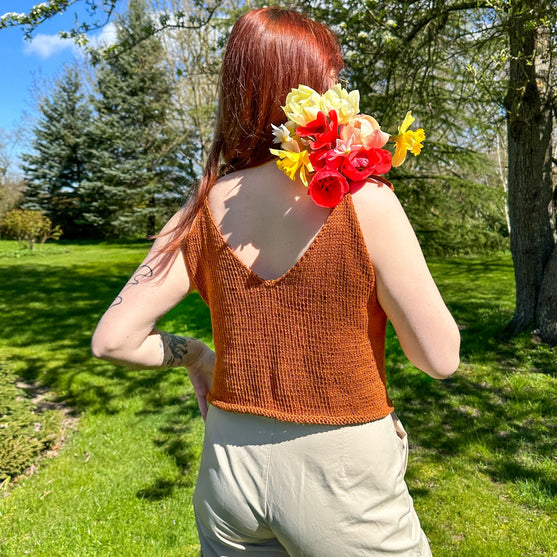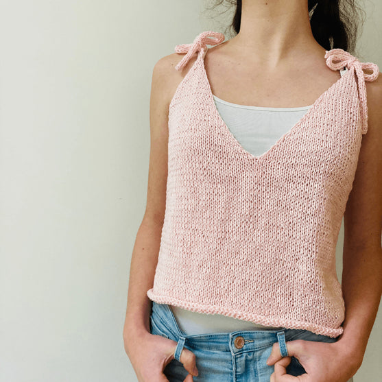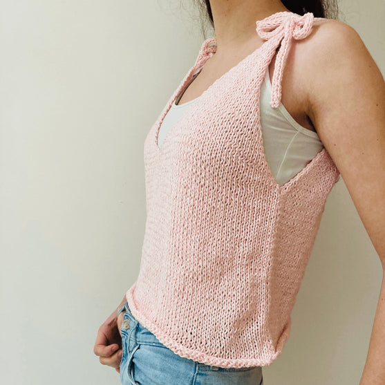 Adorable and fresh little top to wear on a very hot day or as a layer on a cool t-shirt. The top is knitted flat with 2 strands of yarn together, the front and the back are identical and knitted separately then sewn together.
