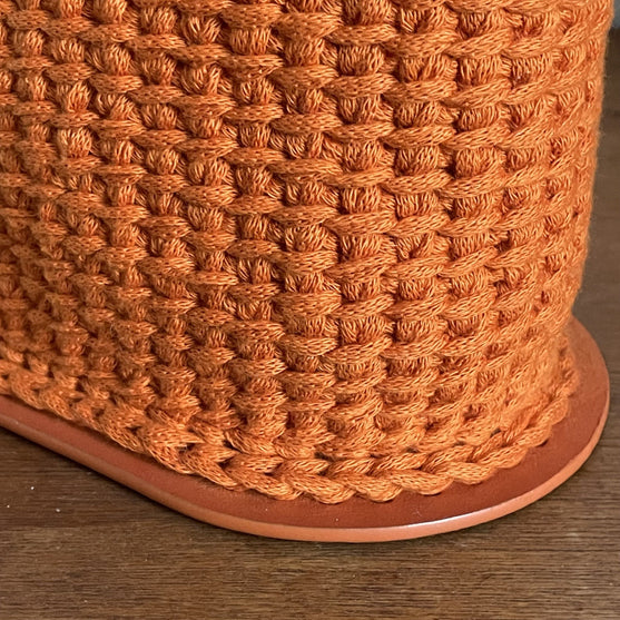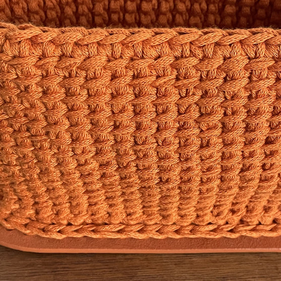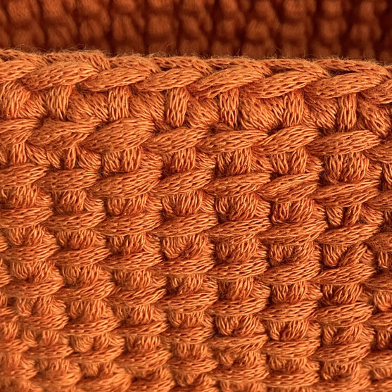 The basket is worked in Tunisian knit stitches. A long piece is worked and sewn together along the short edges. The piece is then crocheted onto the bottom using chain stitches. See a description of how to work the Tunisian knit stitch at the end of the pattern.