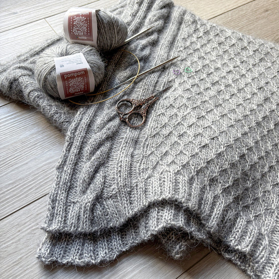 Frostwork – A play on the word needlework, evoking frost patterns on windows. Frostwork is a knit rectangular shawl that blends timeless texture with wintry elegance. It features the embossed trellis stitch framed by chunky cables, invoking the quiet poetry of frost-kissed mornings.