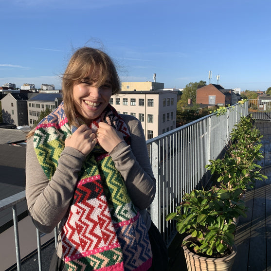 Elver is a big, bold, colorful tube-scarf with colorwork worked in the round following a chart. The scarf is easy to customize by simply mixing and matching your favourite colors.