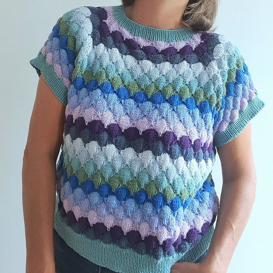 Knit a colorful shirt in a funny linen stitch pattern, which adds a nice structure to the work in the form of bubbles or flickering butterflies. 10 nice colors have been used for the shown model, and Friends Cotton 8/4 exists in a multitude of wonderful colors, meaning there is plenty of opportunity for magnificent combinations.