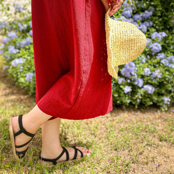 It is crocheted in raffia, so it is very cool and light. You can also add a crochet strip or your favourite scarf, and you'll only use one ball of Rafaella!