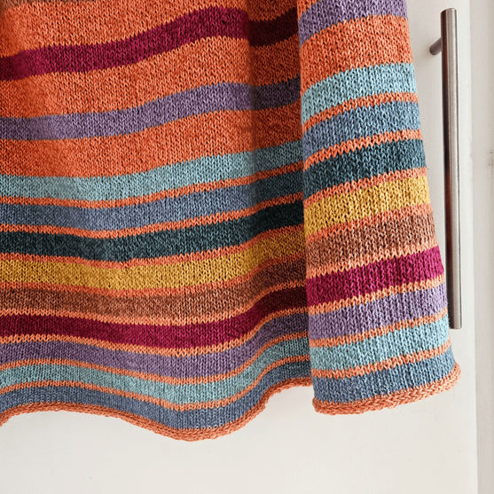 Knit a lovely and colorful skirt in stripes. The skirt is knitted from the top down. The beautiful yarn, Olivin in cotton and linen, comes in 18 gorgeous colors, giving you plenty of options to choose exactly the colors that match your wardrobe. The yarn is made of 50% cotton and 50% linen, giving a fine and lovely texture and a wonderful weight to the skirt, so it drapes beautifully. Perfect for both summer and winter — wear it with sandals in the summer and with a pair of stylish boots in the winter.
