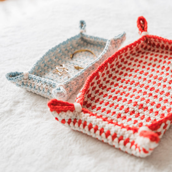Calling all crafters! If you’re looking for a quick and easy crochet project that’s perfect for beginners, you found it! The Tri Color Trays are the perfect solution to tame clutter in any room of your home. Place them on the coffee table to hold your remote, on your desk for stationery and pens, even in the bathroom for jewelry and makeup. Constructed from a rectangle of multi-colored stripes, these trays whip up quickly for housewarming gifts or last-minute décor.