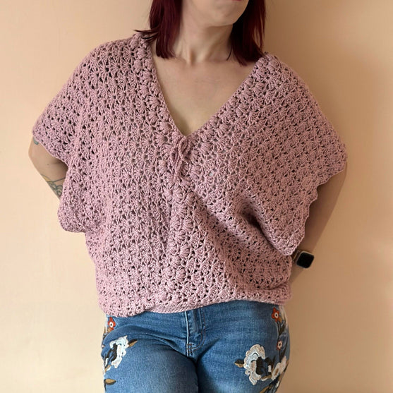 Leave the world behind in a garden full of magic and soft colors with this unique and feminine blouse. The lacy stitch pattern and the unusual seaming makes this top a perfect addition to your handmade wardrobe.