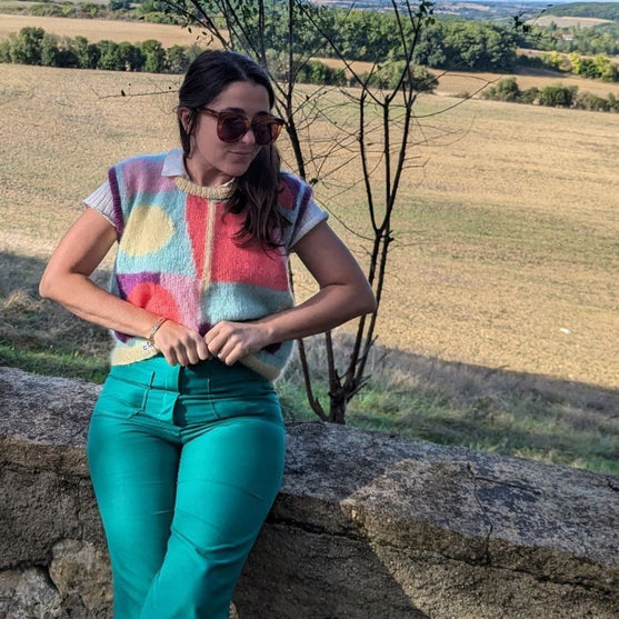 Dive into the graphic and colorful universe of Vasarely with this modest tribute to his art. The Vasarely Vest will add color to your wardrobe and allow you to (re)discover many knitting techniques (intarsia, double collar and armholes, etc.)