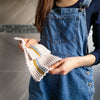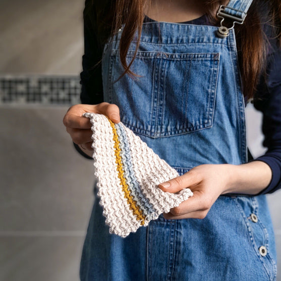 Each cloth is worked as one piece for added strength and durability. You’ll be working in rows, then creating a small hanging loop in one corner and continuing around each edge with a small picot border.