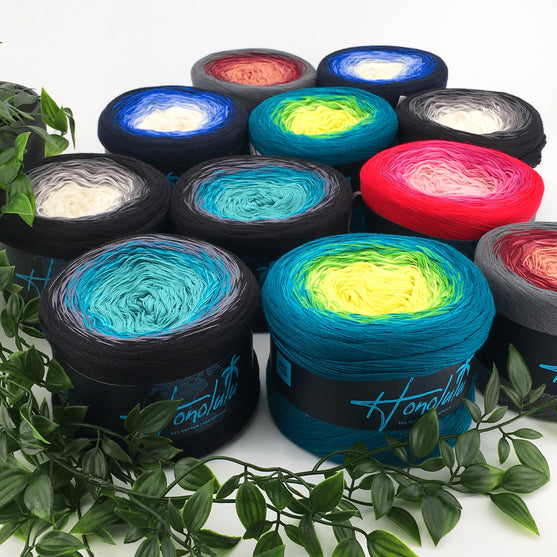 NB: Honolulu a un minuscule noeud solide sur le brin où la couleur change. Une bonne astuce lorsque vous tricotez ou crochetez avec Honolulu, est de passer le fil à travers une petite perle avant de commencer. Ainsi, les brins seront maintenus plus facilement ensemble.