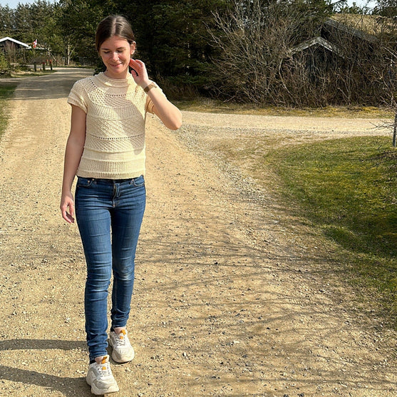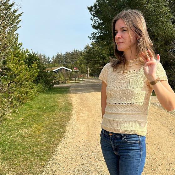 Summer Structure est un joli t-shirt avec des séquences de structures variées. Il comporte un empiècement tricoté en rond et il est facile à tricoter, car les structures sont réalisées simplement avec des m à l’end et des m à l’env assemblées de manières différentes.