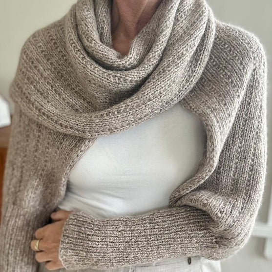 Le châle avec manches Meadow Sunset est une combinaison d’un châle tricoté et un pull. Il est tricoté pour bien que l’on puisse s’envelopper dedans. Il comporte des détails tels qu’un point texturé et une bordure en i-cord. De chaque côté se trouve une bordure en côtes faisant office de manches. La première bordure en côtes est d’abord tricotée, puis des mailles sont relevées pour la partie châle à proprement parler. Le nombre de mailles est enfin réduit de nouveau pour la réalisation de la dernière bordure en côtes.