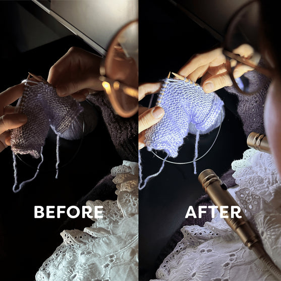 Les deux bouts de la lampe possèdent des ampoules LED qui peuvent être allumées simultanément ou individuellement. Les deux ampoules peuvent être articulées et customisées de manière indépendante, vous permettant d’éclairer un ou plusieurs éléments d’un ouvrage et/ou d’un patron.