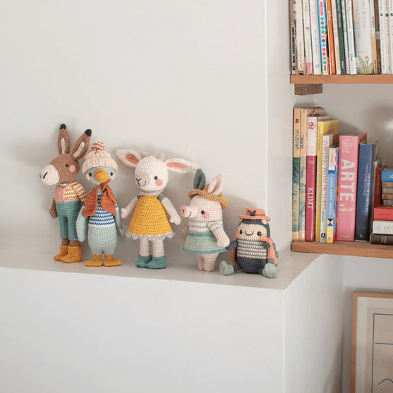La tête, le corps et les jambes sont travaillés en une seule pièce. Mark Duck a aussi 2 accessoires: un bonnet et une veste.