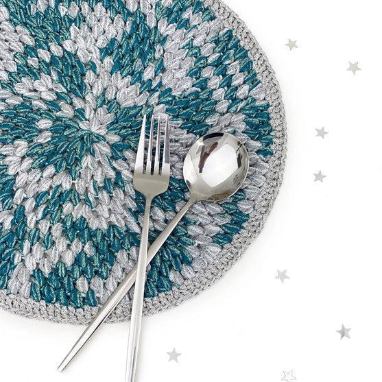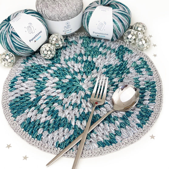 The Kyle Placemat is perfect for adding a pop of color and texture to your home. This handmade placemat makes a lovely addition to your dining table, and it helps to protect surfaces from heat damage or scratches. This pattern is made using Panettone yarn which is perfect for adding a little sparkle to your table during the holiday season. It also works well using Friends 100% cotton yarn.